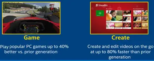 В едином кристалле с 1,3 млрд транзисторов реализованы ЦП, ГП, контроллер памяти, звуковой контроллер и сетевые интерфейсы, поэтому не следует ожидать снижения производительности. Более того, сравнение с процессором предыдущего поколения Intel® Core™ i5-4320Y показало значительный прирост производительности.
