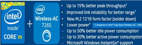 В семействе процессоров Intel Core M также реализованы более скоростные адаптеры WLAN (производительность повышена на 15—100 %) при сниженных на 70 % габаритах за счет использования типоразмера M.2 1216. По сравнению с двухдиапазонным адаптером Intel® Wireless-A7260, у AC7265 значительно повышена надежность каналов, расширено покрытие, поддерживается больше одновременно подключенных устройств и есть возможность потоковой передачи видео с разрешением 1080p. При этом новый беспроводной адаптер расходует на 50 % меньше электроэнергии в состоянии бездействия (4 мВт) и на 30 % при работе (8 мВт при просмотре веб-страниц).