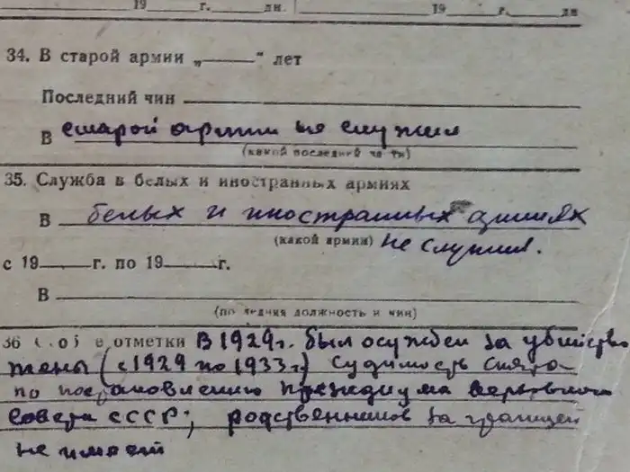 С 1929 по 1933 год он отбывал наказание, и характер его многочисленных татуировок говорил именно об этом. Судим был за тяжкое преступление, но совершенно очевидно, что смягчающие обстоятельства в его деле были, поскольку он отбыл срок всего четыре года, и затем судимость была снята по постановлению Президиума Верховного Совета СССР.