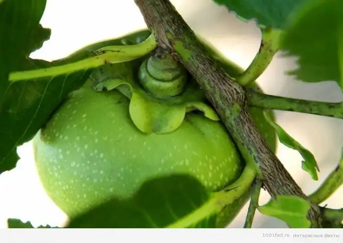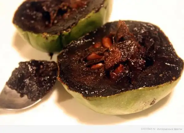 Созревший плод имеет не очень красивый цвет гниющей листвы. Создаётся впечатление, что плод перезрел. Мякоть плода коричневая, напоминает желе. Поэтому этот фрукт называют родственницей хурмы.