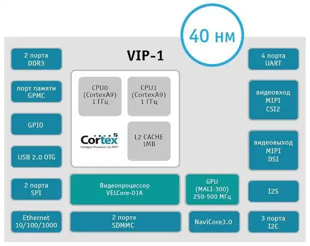 Кроме видеопроцессора в чип входит 2-ядерный ARM Cortex A9 с частотой 1 ГГц, ядро графического процессора, двухъядерный кластер процессора обработки сигналов и изображений и встроенное ядро навигационного приемника, поддерживающее три системы навигации — GLONASS, GPS и китайскую BeiDou. Интерфейсы включают контроллер 1Гбит, что позволит встроить решения на базе VIP-1 в современные IP-системы.