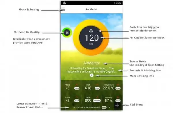 Что только не содержится в таком воздухе — и органические соединения, и пыль, и разного рода газы (где монооксид углерода, угарный газ, едва ли не самое безобидное соединение). Кроме того, в домах и квартирах, которые расположены даже в самых «зеленых» регионах, могут быть вещи, выделяющие в воздух вредные вещества, и в большинстве случаев человек об этом не подозревает. Для того, чтобы точно знать, чем мы дышим, можно нанять передвижную лабораторию, которая за пару дней предоставит анализ воздуха в любом месте. Но это дорого и не очень быстро. Современные технологии позволяют решить проблему быстрее. Сейчас на Indiegogo разработчики устройства Air Mentor собирают средства на реализацию своего проекта. При этом Air Mentor оценивает воздух по ряду факторов, определяя наличие большого количества загрязняющих веществ. Анализ проводится в режиме реального времени.