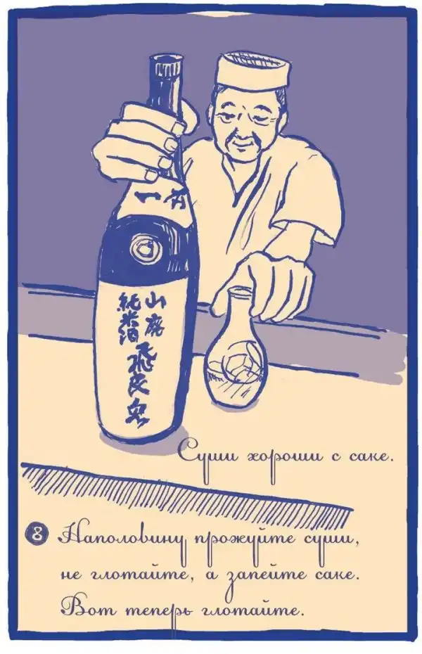 «Надо немного пожевать, чтобы раскрыть вкус. Не глотайте. Затем глоток саке. У каждого саке свой аромат. Когда запиваете им разные суши, получаете гораздо больше впечатлений».
