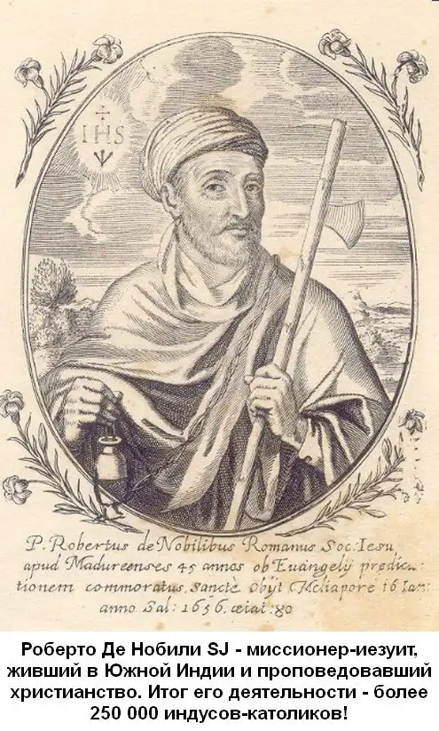 Например, исследователь религиозной жизни Европы немец Генрих Бемер, оставил описание того, как проник в Индию и охмурял в ней брахманов иезуит Роберт де Нобили: "С этой целью он сам превратился в синиази, или кающегося брахмана. Он купил себе шапку огненно-красного цвета, покрывало, красно-жёлтую одежду из муслина и деревянные башмаки кающегося синиази. Затем он обрил себе голову, украсил уши огромными серьгами, выкрасил лоб жёлтой мазью из сандалового дерева, являющейся отличительным признаком брахманов, и поселился в землянке, где жил в уединении в течение целого года, питаясь овощами и водой.