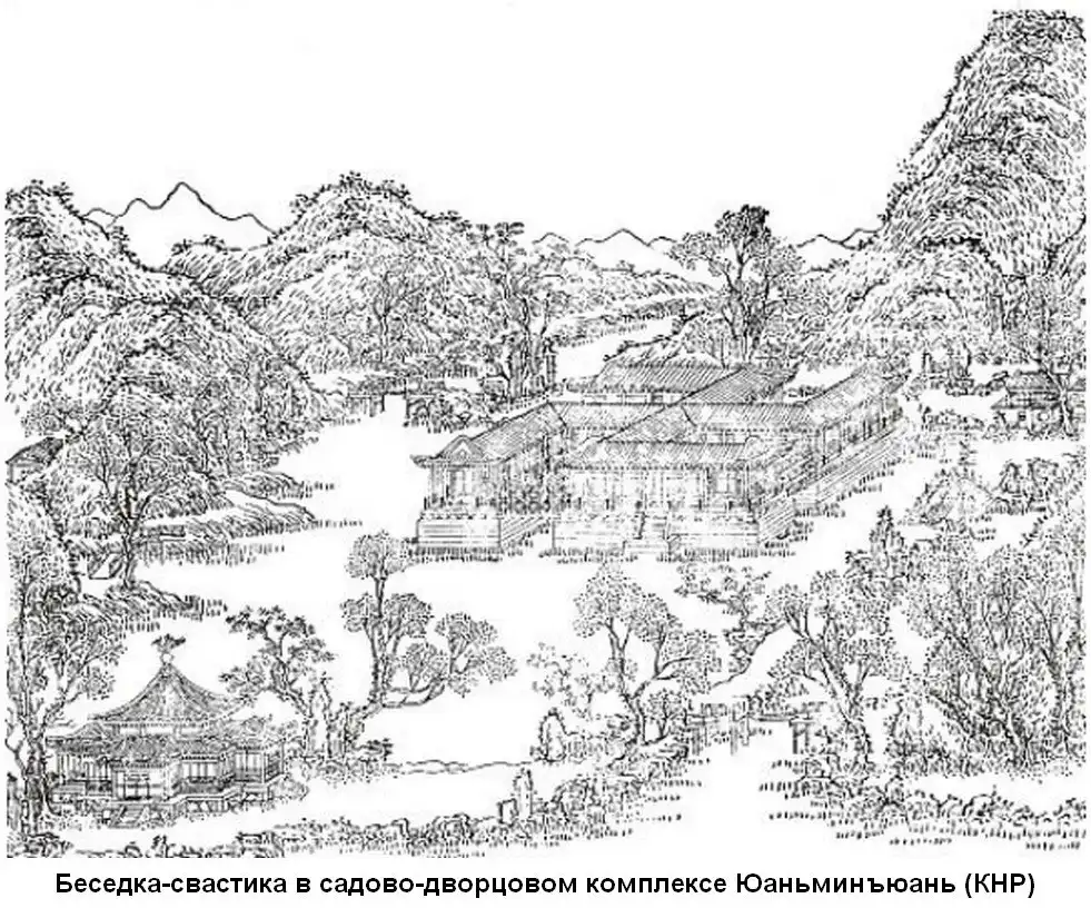 Бывшие "друзья" назвали этот период Второй Опиумной войной и в 1860 году англо-французские войска подошли к Пекину. Император бежал в Горное убежище, а князя Гуна Исиня оставил вести переговоры. Британский и французский послы потребовали, чтобы великий князь Гун до 23 октября принял условия мира, угрожая в противном случае сжечь императорский дворец в Пекине и подвергнуть пушечному обстрелу город. Для устрашения они выбрали дворец Юаньминьюань и подвергли его грабежу и полному разрушению. Этот дворец мешал иезуитам, он не вписывался своим видом в исторические построения Китайской истории и напоминал об истинном происхождении манжуров. Но осталась беседка в виде свастики, её формы были не так заметны.