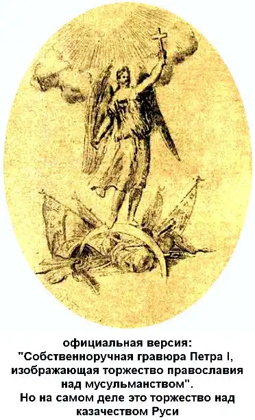 Здесь это приводится в пример того, что Петр I, будучи уже вовлеченным в масонство, жил и рассуждал по Западным меркам. То, чего добивались на Западе, он выполнял блестяще. Вместо того чтобы опереться на казачество Руси, он его уничтожал. Вот как Пётр изобразил торжество над казачеством Руси.
