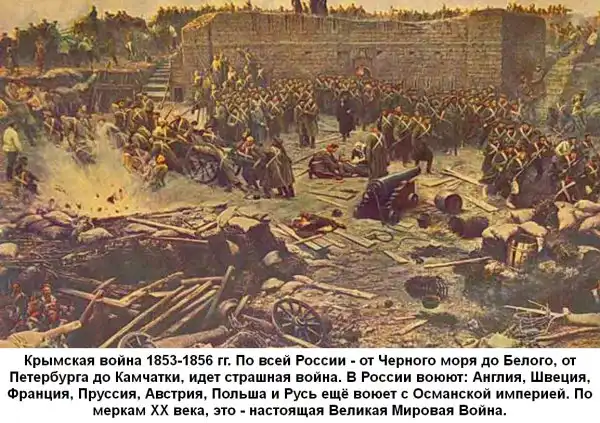 - "Крымская война" 1853-1856 г. Война Запада (в лице его крупнейших держав) против России. За названием скрываются две разные и разномасштабные войны - война России с Османской империей и война России с Западом. Русскому народу эта война преподносится как местный конфликт между Россией и Турцией, в котором Англия была как бы не причём, но это не так. "Крымская война" была развёрнутым, всей мощью огромной Британской Империи, "над которой никогда не заходило солнце", прямым нападением на Россию не только одной Британской Империи, но и её союзников. Британская империя наносила удар не только с юга, с Чёрного моря, - на Крым; но и с севера, с Балтийского моря, прямым захватом столицы России - Петербурга, хотели взять Россию в клещи. Этот факт для многих - неизвестная война Петербурга 1854 года.