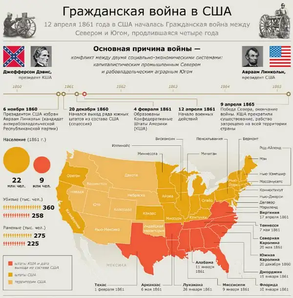 Напомню, что в это время на территории Мексики воевали Англия, Франция и Испания, а Россия послала в Нью-Йорк и Сан-Франциско две эскадры с приказом, на случай вступления в войну Англии и Франции немедленно начать крейсерскую войну в поддержку Севера. В общем, война буржуазного Севера и рабовладельческого Юга была схваткой двух американских элит. Элиты Севера хотели установить господство над всей Северной Америкой, а затем и всей планетой. Индейцы, белые и черные, для элиты Севера были "пушечным мясом". Элиты Юга были довольны сложившимся положением и когда северяне стали оказывать слишком сильное давление, решили воевать за независимость, за свой собственный образ жизни и рабы здесь были не причём. Эту сказку о свободе от рабства, борьбе против эксплуататоров, придумали для нас.