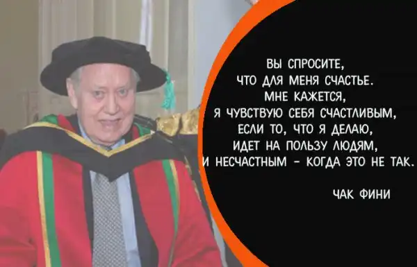 Он основатель Duty Free. Ему 82 года. Он заработал состояние в 7,5 миллиарда долларов. У него нет машины, он летает только эконом-классом и носит Casio на каучуковом ремешке. Его можно было бы назвать скупердяем, если бы не тот факт, что за 30 лет он потратил на благотворительность - образование, здравоохранение, науку, содержание домов престарелых по всему миру - более 6 миллиардов долларов, оставаясь при этом в тени. Билл Гейтс назвал Чака Фини идеальным образцом для подражания, отметив, что он является лучшим примером того, как следует творить добро при жизни.