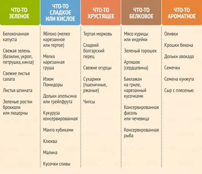 Если вы любите экспериментировать на кухне и постоянно удивлять свои вкусовые рецепторы, то предлагаем вам таблицу, на основе которой вы сможете каждый день баловать себя совершенно новым салатом. Таблица составлена на основе простого правила, согласно которому в идеальном салате должно быть что-то хрустящее, что-то сладкое или кислое, что-то белковое, что-то зеленое и что-нибудь, обладающее насыщенным вкусом.