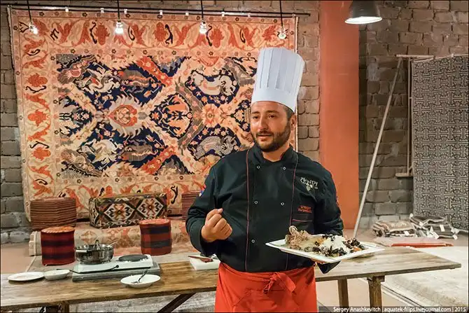 Финальный аккорд нашей экскурсии стал полной неожиданностью. Пройдя через склад, мы увидели… накрытые прямо среди сотканных ковров столы. Мегеряны еще и ковровый ресторан сделали у себя на фабрике!