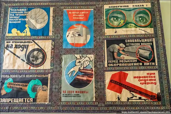 Перед входом в цех невозможно пройти мимо старых советских плакатов по ТБ.