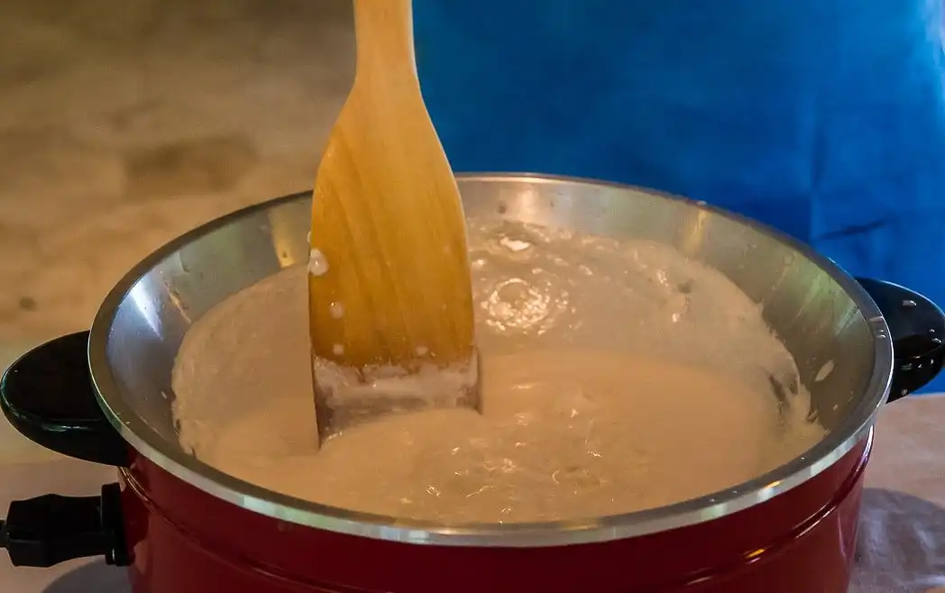 Потом молоко кипятят на медленном огне, помешивая, чтоб не подгорело: