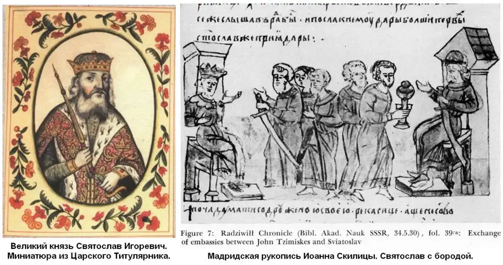 Ставшим уже каноническим изображение князя Святослава с бритой головой, длинным чубом и вислыми усами, как запорожский казак, не совсем верное и навязано в основном украинской стороной. Его предки имели роскошные волосы и бороды, а сам он изображался в разных летописях бородатым. Описание чубатого Святослава взято от выше упомянутого Льва Диакона, но таким он стал после того, как стал князем не только Киевской Руси, но и князем Печенежской Руси, то есть южной Руси. Но почему тогда печенеги убили его? Здесь всё сводится к тому, что после победы Святослава над Хазарским Каганатом и войной с Византией, иудейская аристократия решила отомстить ему и подговорила печенегов убить его.