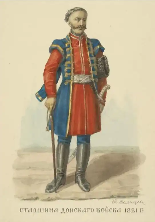 -Первым справа стоит казак хопёрского полка, вооружен кавалерийским кремниевым ружьем и донской шашкой.