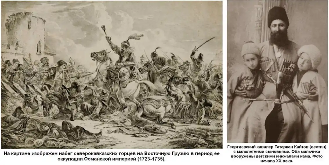 А здесь ниже, уже появляется разнобой в воинском обмундировании. Свои исторические корни стали забываться, а воинские атрибуты копируются уже у кавказских народов.
