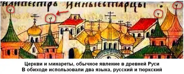 В Ордынской Руси использовалась не только славянская письменность, но и арабская. Русские вплоть до конца XVI века на бытовом уровне хорошо владели тюркским языком, т.е. тюркский язык до тех пор был вторым разговорном языком на Руси. А способствовало этому объединение славяно-тюркских племён в союз, имя которому - казаки. После прихода к власти в 1613 г. Романовых, они, из-за вольности и непокорности казачьих племён, стали насаждать миф о них, как о татаро-монгольском "иге" на Руси и презрении ко всему "татарскому". Было время, когда христиане, славяне и мусульмане молились в одном храме, это было единоверием. Бог один, а вероисповедание разное, это потом уже всех поделили и развели в разные стороны.