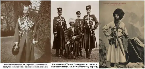 На средней фотографии выше мы видим курдов, одетых по черкесскому образцу, т.е. этот атрибут воинского облачения уже привязан к черкесам и в дальнейшем так и закрепится за ними. Но на заднем плане мы видим турка, единственное чего у него нет, так это газырей, этим и отличается. Когда Османская империя вела войну на Кавказе, народы Кавказа переняли у них некоторые воинские атрибуты, также, как и у гребенских казаков. В этом смешении обмена культур и войны и появилась всеми узнаваемая черкеска и папаха. Турки - османцы, серьёзно повлияли на исторический ход событий на Кавказе, поэтому некоторые фотографии пестрят присутствием Турков с кавказцами. Но если бы не Россия, многие народы Кавказа исчезли бы или ассимилировались, как например чеченцы ушедшие с турками на их территорию. Или взять грузин, которые попросились под защиту от Турков у России.