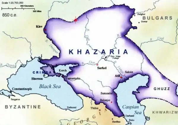 В VI веке был создан Великий Тюркский каганат. Некоторые племена бежали от него, как например венгры в Паннонию, а хазарские славяне (козаре, казара) в союзе с древними булгарами, соединились с Тюркским Каганатом. Их влияние дошло с Сибири до Дона и Черного моря. Когда Тюркский Каганат начал разваливаться, хазары приняли у себя бежавшего царевича династии Ашин и прогнали булгар. Так и появились хазаро-тюрки.