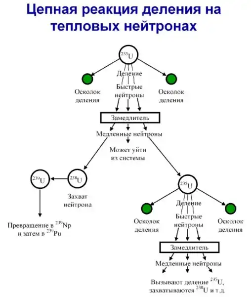 Большая часть энергетических ЯР работает на тепловых (медленных) нейтронах. В таких реакторах для замедления нейтронов используются графит, тяжелая вода (в молекуле которой вместо атомов водорода атомы изотопа водорода - дейтерия) и обычная вода. При проектировании самых первых ЯР ученые имели в своем распоряжении только естественный уран, содержащий примерно 99,3% урана-238 и только лишь 0,7% урана-235 (есть еще кстати три тысячных процента урана-233). Из этих двух изотопов уран-235 делится на нейтронах любой энергии, но лучше всего - медленными нейтронами, а уран-238 делится только очень быстрыми нейтронами.