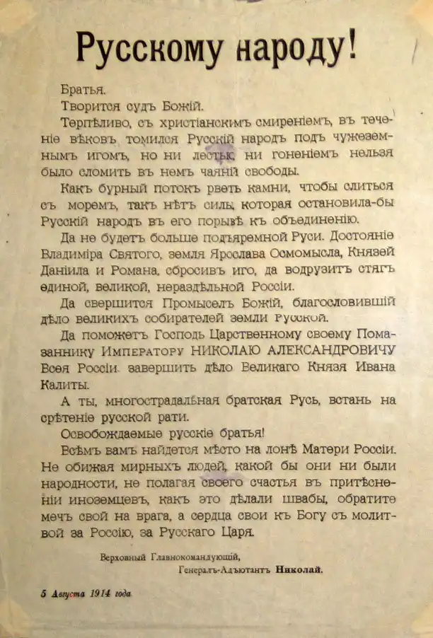 Воззвание Великого князя Николая Николаевича, Верховного Главнокомандующего. Листовка.5 августа 1914