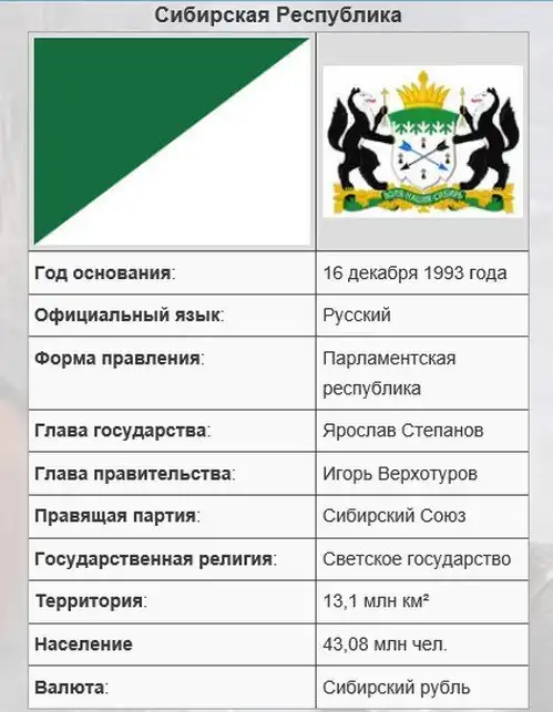 - Сибирская республика - самопровозглашенное государственное образование, действовавшее с июня по ноябрь 1918 года на территории Российской республики, охваченной Гражданской войной, от Урала до Тихого океана, включая КВЖД и Харбин. В первую неделю существования, государство было признано Соединёнными Штатами Америки, и большинством Европейских государств. Столицей новообразованной республики согласно голосованию временного правительства, была объявлена Тюмень.
