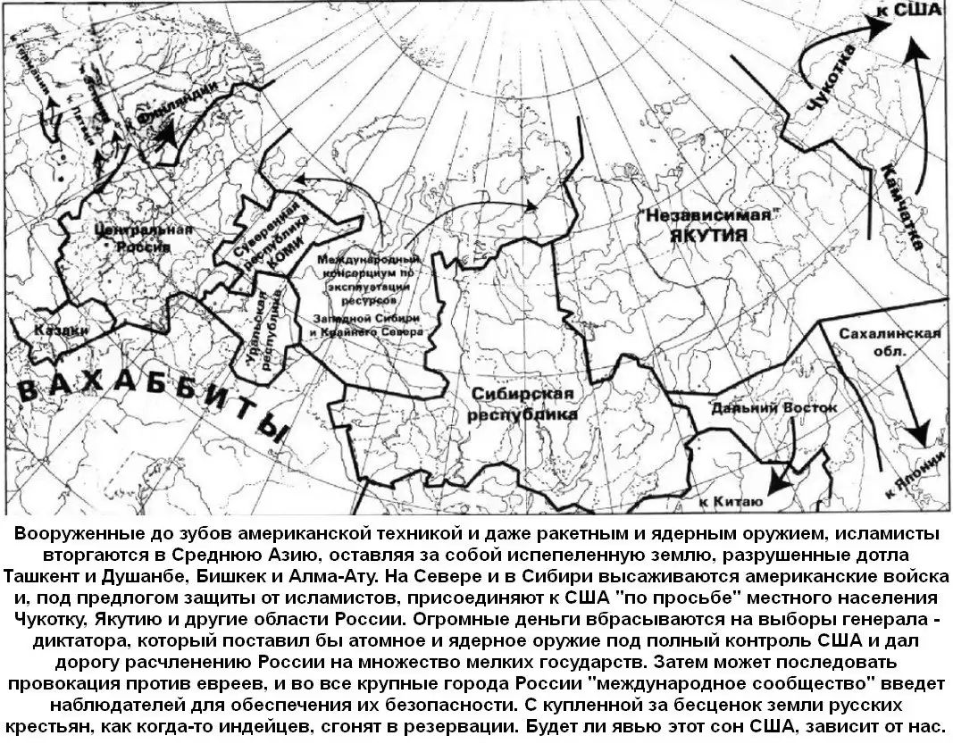 Для американских аналитиков вопрос, останется ли Сибирь русской вообще, уже не стоит. Американские стратеги видят сегодня основную геополитическую альтернативу: Россия уступает Соединенным Штатам Сибирь, и Америка получает "опорные территории" на континенте, а вместе с ними и абсолютное господство в Евразии. Поэтому мирное вторжение Америки в Сибирь и создание вследствие этого "нового мирового порядка" - реалии очень недалекого будущего. Но по мнению американцев, если Россия будет сопротивляться, то Сибирь отдадут Китаю и будут после со стороны наблюдать, как китайцы и русские в кровавой мясорубке уменьшают количество своего населения.