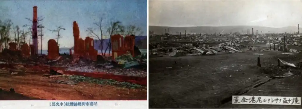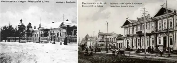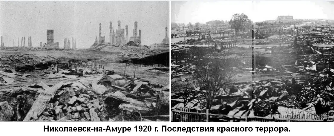 Ниже вы можете увидеть г. Николаевск-на-Амуре до разрухи и после, когда красные комиссары пришли устанавливать Советскую власть.