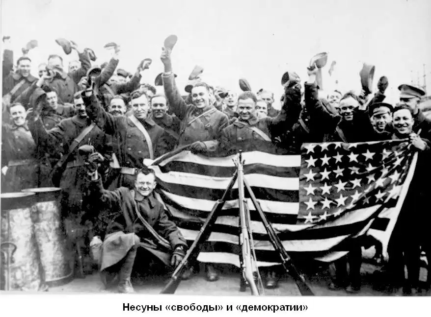 Что делали Американцы в Сибири с 1918 года? Политика США по отношению к России, отличалась лицемерием и вероломством. Во всех официальных документах и выступлениях руководители правительства США заявляли о своей любви к русскому народу и о намерении "помочь России". На деле они стремились ликвидировать любую власть, расчленить Россию и превратить её в свою колонию. Для этого они финансировали и стравливали как красных, так и белых, в тоже время обе официальные противоборствующие стороны в гражданской войне и "белые" и "красные" сотрудничали с англо-американскими оккупантами!