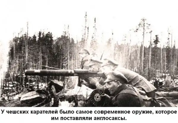 Чехословацкая армия была ударной карательной армией в составе войска англо-американской коалиции и подчинялась лично американскому генералу Гревсу, а непосредственно чешской армией командовал французский генерал Жанен. Одной из чешских под-армий командовал перебежчик - русский генерал Войцеховский. На вооружении чехов были не только американские бронепоезда, артиллерия, пулемёты и стрелковое оружие, даже были дирижабли. Всё самое современное оружие, какое было на вооружении американской армии, было и у чехов, и сама чехословацкая армия была под американским командованием. Поэтому Чехословацкую армию ни в коем случае нельзя рассматривать изолированно, - это был чехословацкий иностранный легион в составе американской армии.