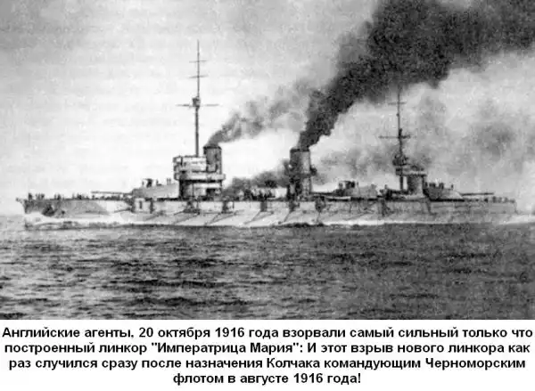На этой же странице своей книги, Баллард сообщает о Колчаке: "Черноморский флот, которым командовал Колчак до революции - взбунтовался... ". - Это ли лучшая характеристика адмирала, что флот под его командой взбунтовался? "... при этом, в то время как многих офицеров мятежники линчевали, у Колчака волос с головы не упал, когда его мятежники доставили на шлюпке на берег!" - Прекрасно! Моряки стали пиратами, захватили флот, а адмирала доставили на берег, в целости и сохранности! - Почему? Об уничтожении Черноморского флота всегда мечтала и сейчас мечтает Британская империя, которая "рулит морями". Агентами Британии был и небезызвестный лейтенант, работавший под "немца" - Пётр (Пинкас) Шмидт, которого англофильская пресса сделала "русским национальным героем", захвативший броненосец Потёмкин. Английские агенты, 20 октября 1916 года взорвали самый сильный только что построенный линкор "Императрица Мария" и этот взрыв нового линкора как раз случился сразу после назначения Колчака командующим Черноморским флотом в августе 1916 года!