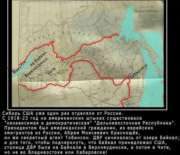 Для начала по этому сценарию оторвали Дальний Восток. В 1920 году, под эгидой США образовалась ДВР - Дальневосточная Республика со столицей на Байкале в Верхнеудинске и с президентом ДВР, американским гражданином - русским евреем, бывшим эмигрантом в США Абрам Моисеевичем Краснощёком, который имел паспорт американского гражданина Stroller Tobinson. Американцы ликвидировали ДВР только после того, как убедились, что власть в Сибири и на дальнем востоке после завершения совместных с Троцким карательных операций в Сибири передана ему же, американскому гражданину, как и Краснощёк, приехавшему из Нью-Йорка, Лейбе Бронштейну-Троцкому, который в то время был неограниченным диктатором Совдепии в должности ПредРевоенсовета. Но просчитались, Сибирь под знаменем большевиков и под управлением Сталина, ушла от американской мечты навсегда.