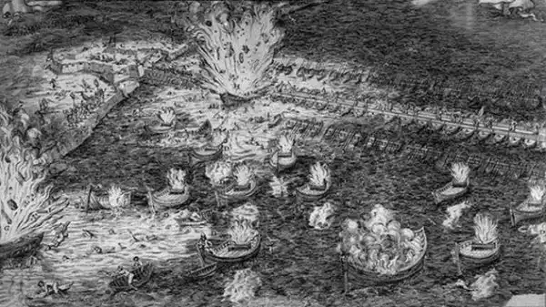 Шел 1584 год, шестая долгая зима Восмидесятилетней войны, и Федерига Джамбелли мог почувствовать месть в воздухе. Годы назад он предложил свои услуги конструктора оружия при испанском дворе, но его обсмеяли. В гневе он переехал в Антверпен, где, наконец, нашел возможность отомстить за оскорбленное итальянское эго. Отмечая победу над османами, Испания послала герцога Пармы осадить Антверпен, который стал центром голландских сепаратистов. Герцог надеялся задушить город блокадой судов через реку Шельда. Антверпен ответил, послав горящие корабли - буквально корабли в огне - на блокаду. Со смехом испанская армия отталкивала их пиками, пока суда не сгорели и не рассыпались в реке. Тем не менее, желая отомстить испанцам, Джамбелли испросил городской совет дать ему 60 кораблей, обещая прорвать блокаду. Город дал ему всего два.