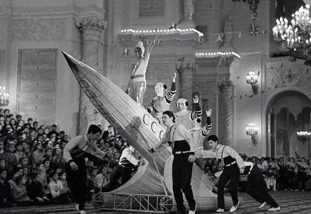 Во-вторых, нужно было обеспечить ребенка билетом на новогоднюю елку, подарком, костюмом снежники из марли или нарядом зайчика и мандаринами. Подарок, в составе которого были и карамельки, и яблоки, и грецкие орехи, предоставлял родителям профком. Мечтой каждого ребенка было попасть на главную елку страны — сначала в Колонный зал Дома Союзов, а после 1954 года — на Кремлевскую елку.