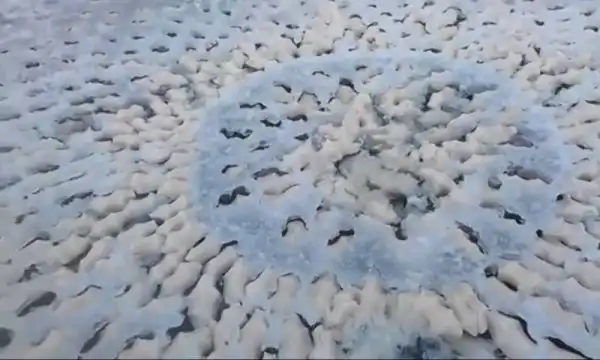 Запись была сделана на озере в американском штате Юта. Образование имеет круглую форму с небольшими проталинами, направленными к центру. Под слоем льда были обнаружены плавающие сгустки, вероятно, органического происхождения. Авторы ролики описали их как «склизкие».