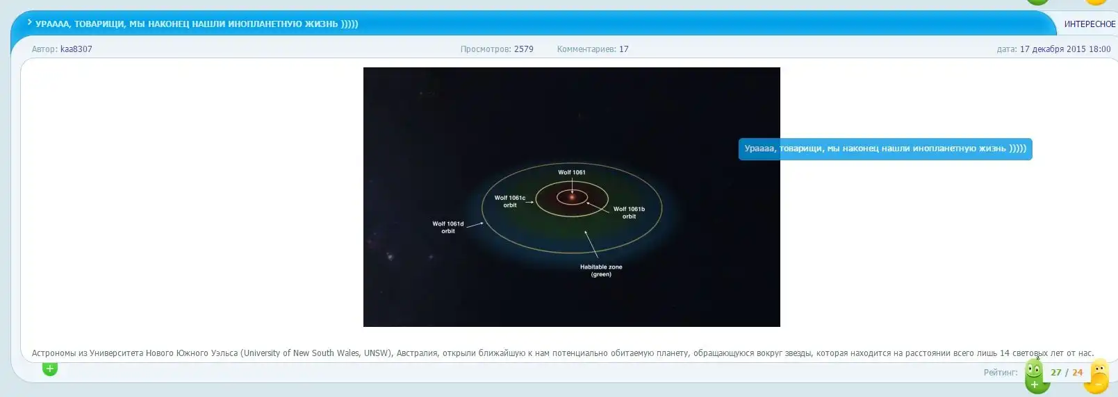 Открытие пригодной для жизни планеты у звезды Wolf 1061 аж на 8 световых лет приблизило к нам потенциальных братьев по разуму. До этого считалось, что они могли бы обосноваться у звезды Глизе 667С (Gliese 667C), расположенной в 22 световых годах от нас. Там были обнаружены сразу три планеты, находящиеся внутри зоны обитаемости.