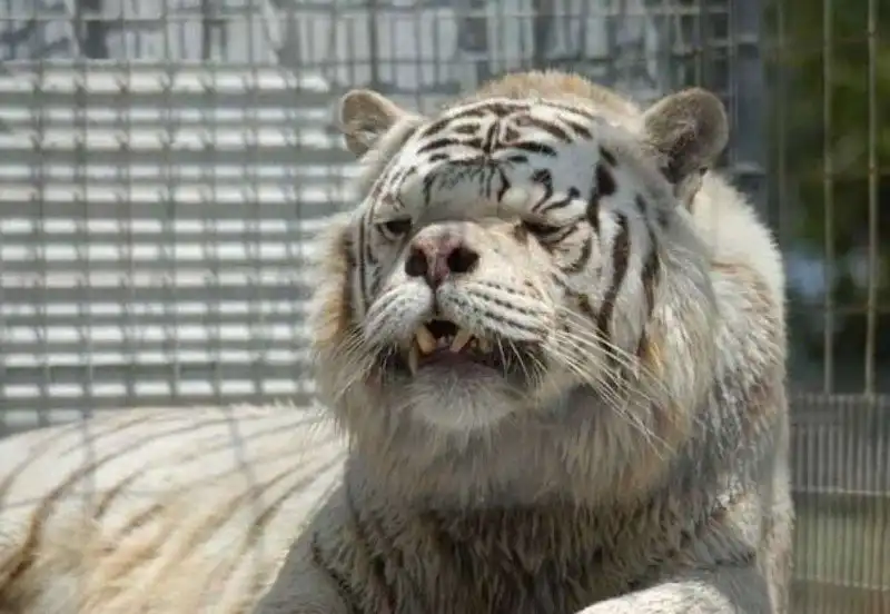 Это Кенни. С ним никто не хотел дружить, потому что он умственно отсталый тигр. У него деформированы нос и клыки, из-за чего Кенни трудно дышать и до конца не закрывается пасть. А ещё, из-за неправильного строения костей он хромал. С момента своего рождения в 1999 году Кенни жил в зоопарке города Бентонвилль в Арканзасе.