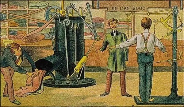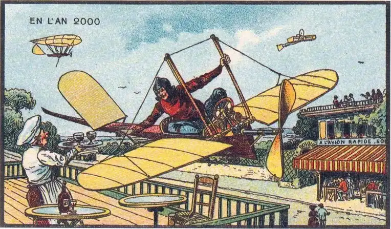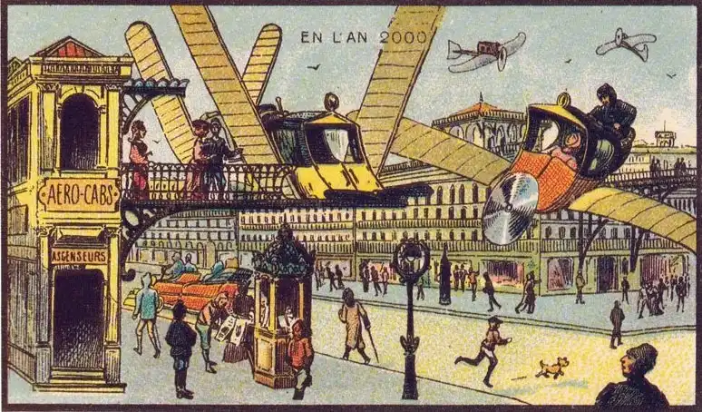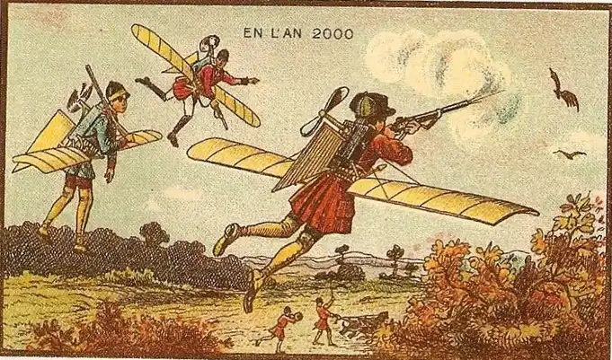 Знаменитый в свое время французский живописец Жан-Марк Коте, в 1900-х годах нарисовал свою фантазию под названием "В 2000 году". Сначала его картинки выпускались, как развлекательные иллюстрации в сигаретных наборах, а после разорения фабрики, тиражировались в коробках с игрушками.