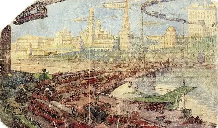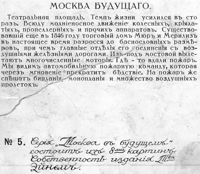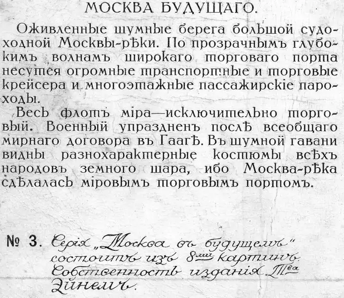 Идею предсказания будущего подхватили и в России. На кондитерской фабрике "Товарищество Эйнем" (позже "Красный Октябрь") в 1914 году производили продукцию с наименованием "Москва будущего" со вставкам карточек на соответствующую тему, к которым прилагалось описание фантазийного сюжета. В тогдашней империи пошли дальше и попробовали продемонстрировать своим современникам 21 век.