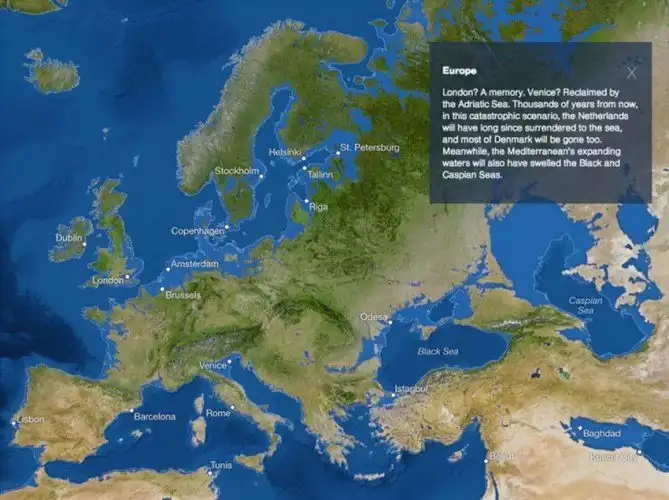 Санкт-Петербург и Ленинградская область окажутся под водой, финский залив будет до Великого Новгорода и Пскова. Уровень воды в Черном и Каспийском морях повысится, образуется канал, соединяющий оба моря. Кавказ окажется отрезанным от Азии, а Крым станет островом. Затопит всю Прибалтику, Нидерланды, Данию. Прекрасная Венеция скроется под водой и станет подводным музеем.