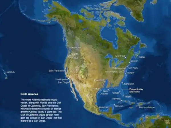 Восточное побережье уйдет под воду, исчезнет целый штат Флорида. Уйдут под воду и страны Мексиканского залива. Кубы практически не станет. Меньше всего пострадает западное побережье США.
