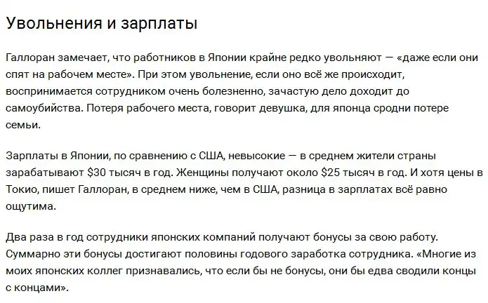 Американский блогер Мэри Галлоран проработала в Японии 6 лет и решила рассказать о корпоративной культуре работников этой страны. Девушка отметила, что японцы привыкли работать сверх нормы, практически не пользуются отпусками и больничными, а также редко увольняются со своего места работы. Более подробно обо всем этом читайте далее.