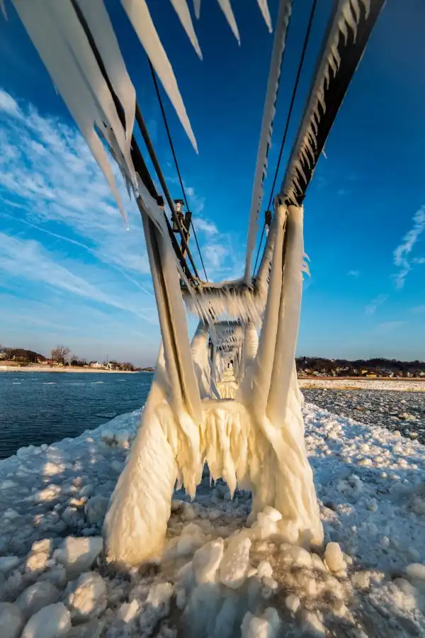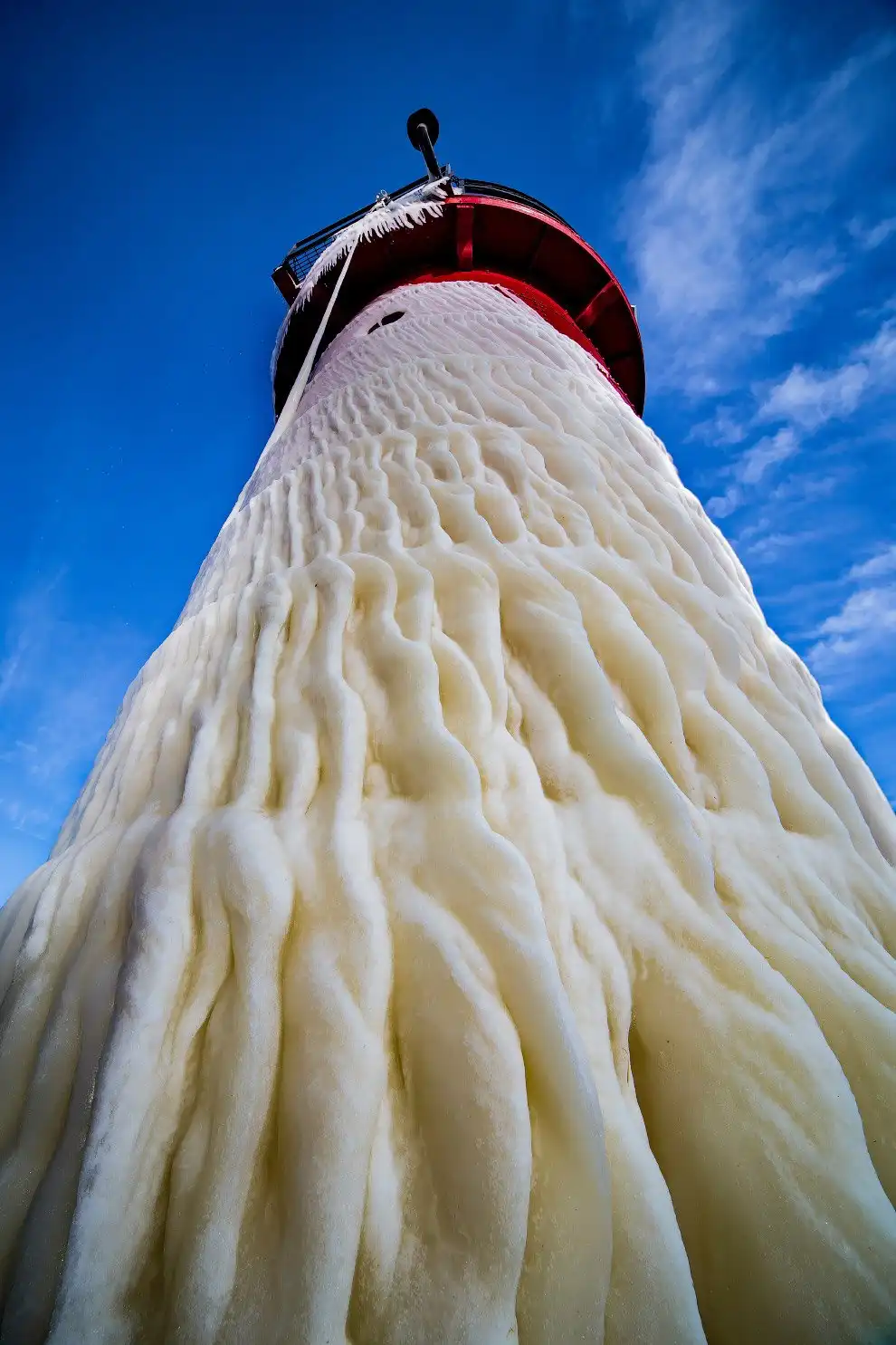 Когда температура опускается ниже нуля, а на озере Мичиган бушуют шторма, эти 9-10 метровые маяки превращаются в гигантские сосульки.