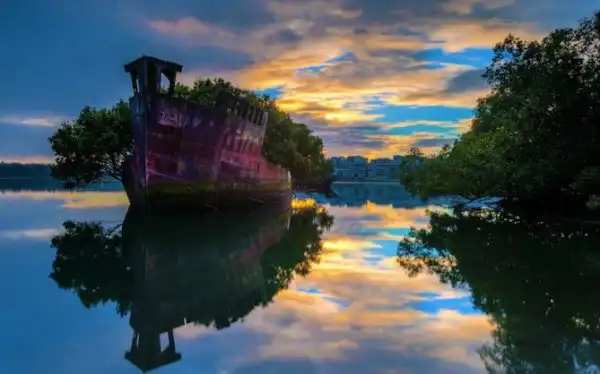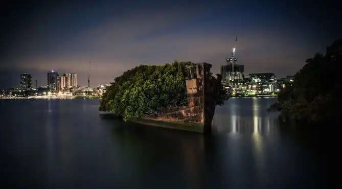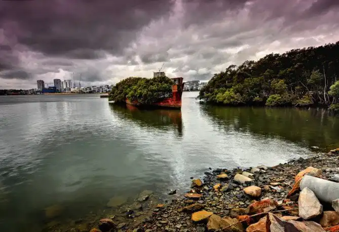 Это всеми забытое судно, находящееся в заливе Homebush Bay на южном берегу реки Парраматта, неподалёку от австралийского Сиднея. Во время Второй мировой войны SS Ayrfield, построенный для перевозки угля в 1911-м году в Великобритании и достигающий 80-ти м в длину, использовался американскими войсками как транспортировщик боеприпасов. Неизвестно, как это случилось, но корабль забросили, в результате сегодня он представляет собой что-то вроде большого искусственного острова.