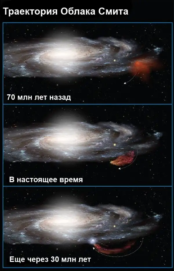 И это тот случай, когда "Кто слишком вознесся, тому будет больно падать" - облако идет по баллистической траектории после выдувания из нашей собственной галактики, 70 миллионов лет назад.