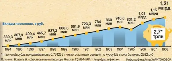 В 1914 г. в Государственной сберегательной кассе было вкладов на 2,236 млрд руб. С 1904 г. накопления россиян на сберегательных счетах постоянно увеличивались - за исключением 1905 г., на который пришлись Русско-японская война и революция.
