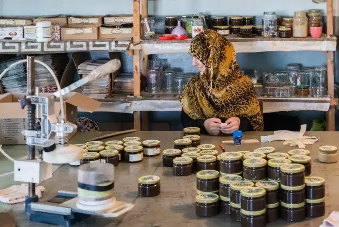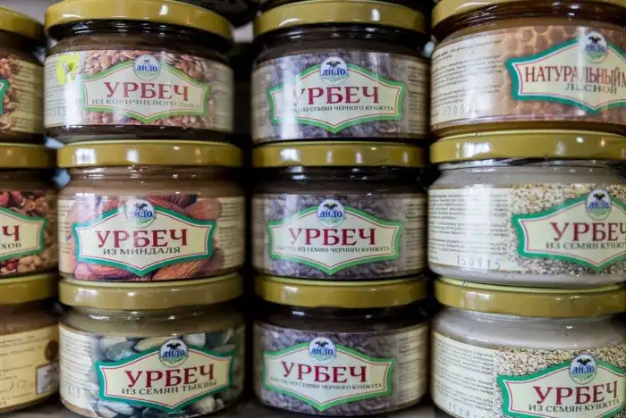 Урбеч, который производит фирма Джамала, — это густая масса из перетертых семян множества растений: от грецкого ореха и тмина до экзотических амаранта и чиа. На дагестанских рынках издали видны высокие башни разноцветных банок с урбечем из миндальных и абрикосовых косточек, но популярнее всего на Кавказе, безусловно, черный льняной урбеч. Недаром по одной из версий само это слово происходит от названия льна на аварском.
