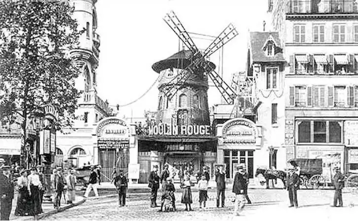 Название «Мулен Руж» переводится на русский язык как красная мельница. Это заведение отличалось от настоящих построек промышленной сферы, коих на Монмартре конца XIX века было около 30. Место было выбрано неслучайно. Открыть кабаре в районе, освобожденным от налогов на алкоголь, оказалось выгодно со всех точек зрения. Монмартр был популярным местом развлечения французской богемы.