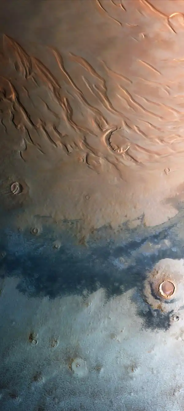 Обратите внимание на обрывистые утесы полярной шапки, которые выявляют ее слоистую структуру. Посмотрите на тонкую ледяную глазурь, покрывающую Приполярье. Рассмотрите округлые ореолы у кратеров, которые возникли когда метеоритные удары растапливали замерзшую грунтовую воду, грязь растекалась вокруг катера, но быстро замерзала.