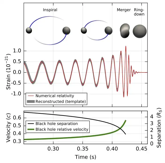 Слияние черных дыр происходит, когда две черных дыр вращаются по спирали друг относительно друга, излучая энергию в виде гравитационных волн. Эти волны имеют характерный звук (ЛЧМ), который можно использовать для измерения массы двух этих объектов. После этого черные дыры обычно сливаются.
